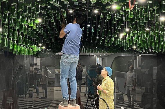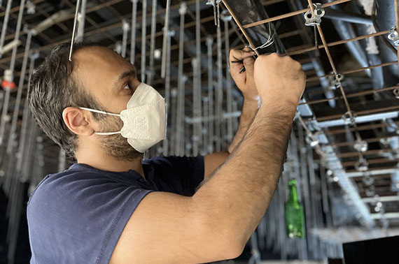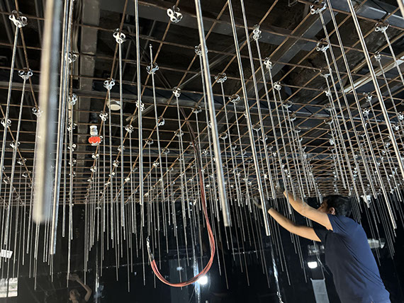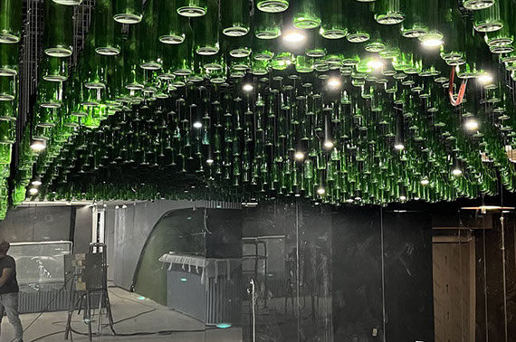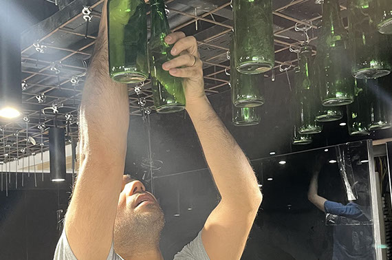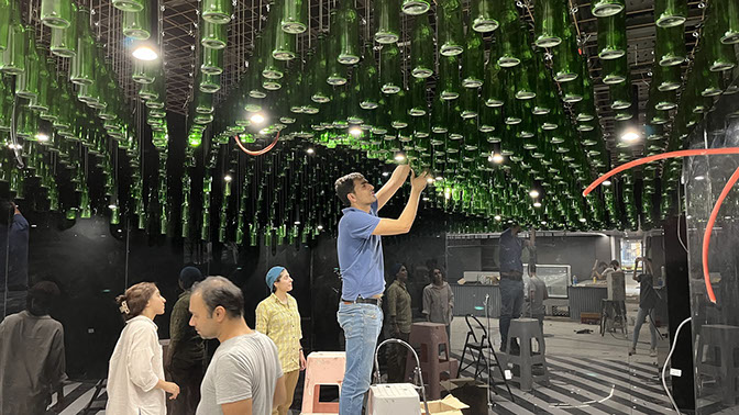 We designed and built a parametric installation for the entrance of Tiada Lounge, using green bottles as the main element. I used computational tools to calculate the length and position of the screws needed to hang the bottles. Our team then cut and processed the 1-meter screws and attached the nuts to the bottle caps. Finally, we hung the bottles in a specific order on the steel mesh network that we had previously fabricated according to the plan. This project was one of the most fascinating and engaging ones that I participated in at Dahi Studio.