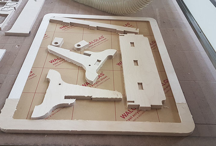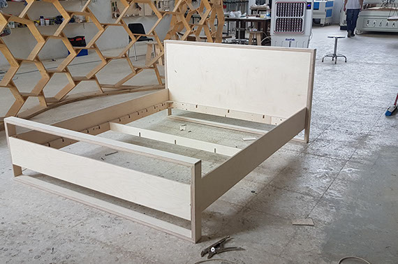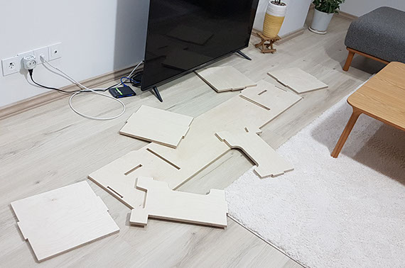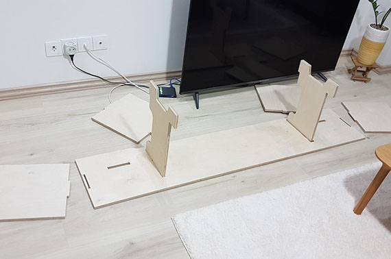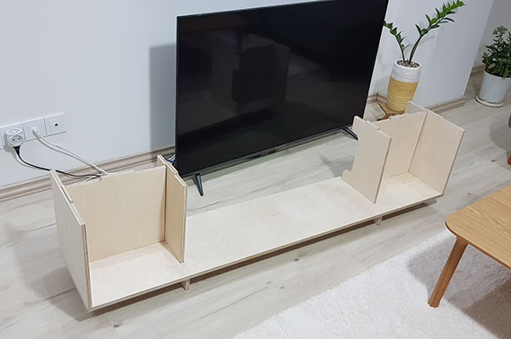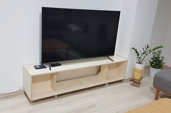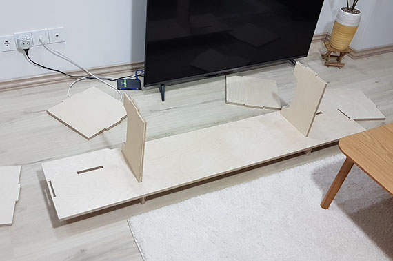 I designed several pieces of furniture and accessories for our new home, including a bed and a TV table. I created all the intricate details and developed G-codes for the CNC milling machine. My wife and I did all the sanding and coating of the furniture ourselves, making it a valuable experience. Detail design has always been my favorite stage, and I took great care in designing the TV table parts so that they could be assembled without screws or connectors.