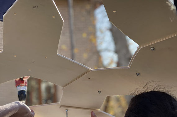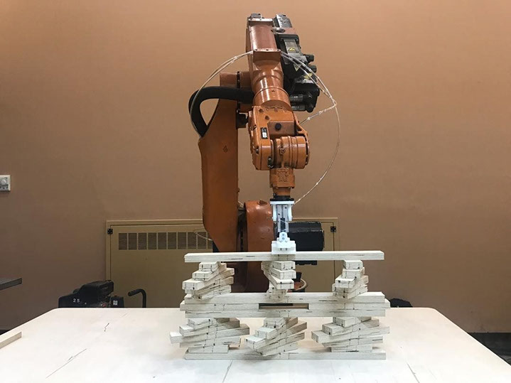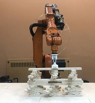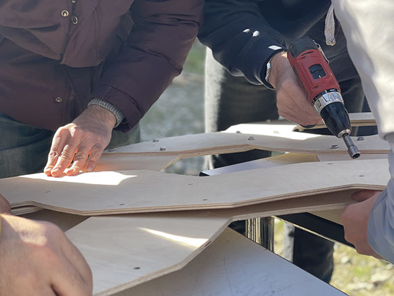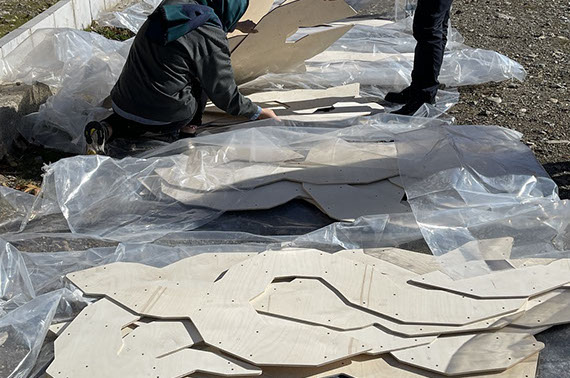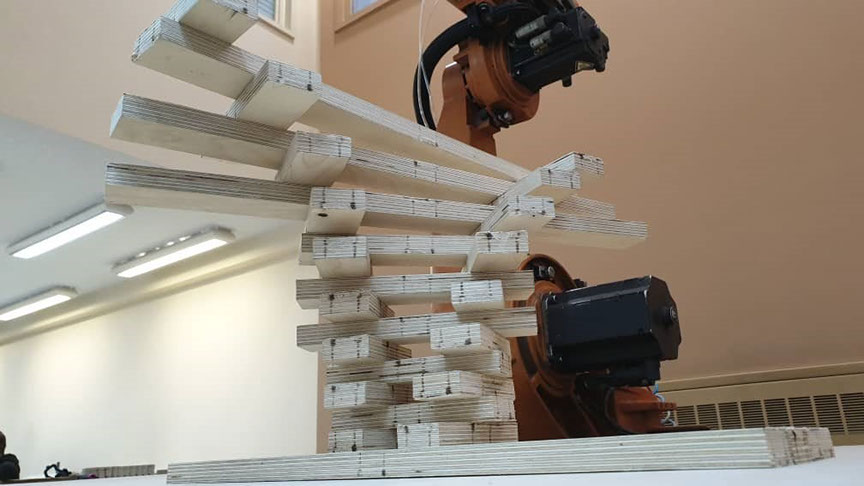Once the teams had completed introductory tasks and were familiar with practical challenges such as properly defining planes to prevent collisions with the robot arm, as well as installation of pneumatic gripper and air pump, they began designing a pavilion on a one-to-one scale. All the proposals were assessed, and one was ultimately chosen for the final project. Modifications were also made to finalize the design.