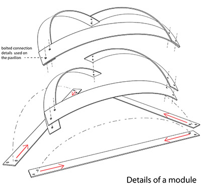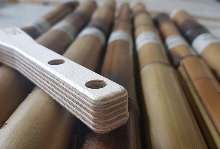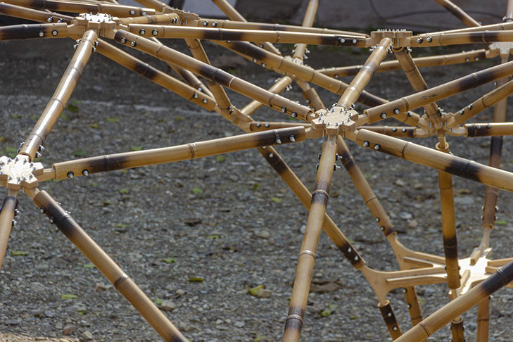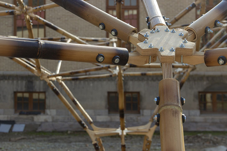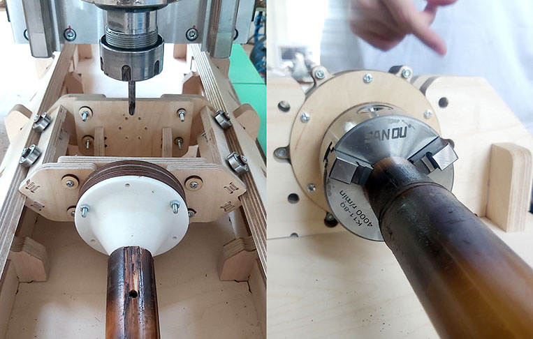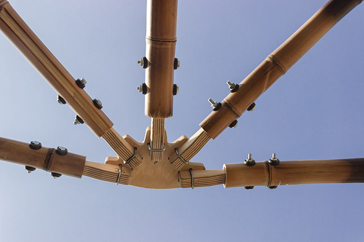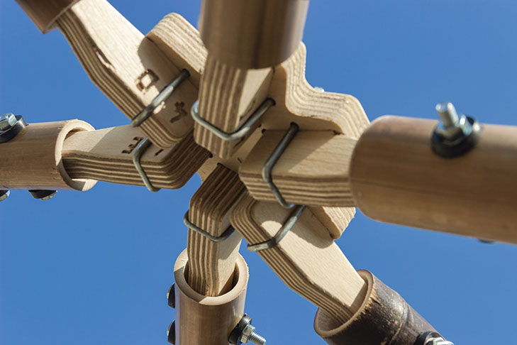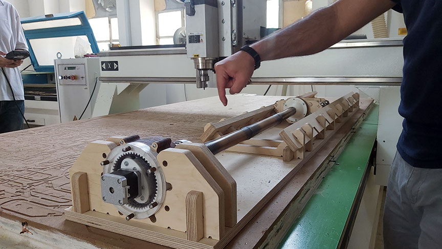 The workshop aimed to cover five key research areas, including material study, sustainability, computational design, form-finding, structural design, and digital fabrication. Instructors and collaborators from different institutions and backgrounds including me were gathered together to share our skills and experiences. Several systems were proposed, and after evaluating them based on visual elegance, ease of fabrication and assembly, structural performance, durability, and cost, a handful of them were shortlisted as final candidates. The elected system was prototyped and refined, and students were encouraged to participate in form design using either form-finding methods or freehand designs. The final form was then selected based on votes. To visualize the design in LOD 400, the team used BIM modeling to perform clash detection prior to fabrication and extract fabrication data. The result was a fully detailed 3D model that included labels for each element, which could also be used as a coordination model in the assembly process. Additionally, the team created shop drawings of the nodes and handles. These parts were to be milled from plywood sheets with a 3-axis CNC machine. For the drilling stage of the bamboo poles, I designed and fabricated a custom rotary tool mostly out of plywood. I also built a harmonic drive for the rotator using 3D printed and laser-cut parts, ball bearings, a stepper motor, and an Arduino board. The team then used the rotary axis and the correct tool path to start drilling the poles with the CNC milling machine. The rotation angles of each pole were retrieved from the BIM model previously prepared in Grasshopper. I wrote an algorithm to generate the Arduino program for each rotation using this information.